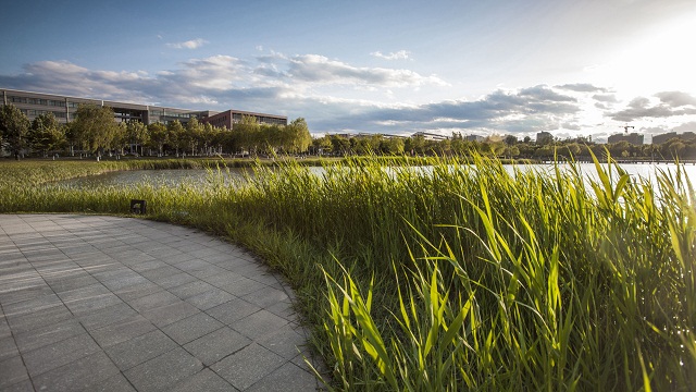 良鄉校區的點睛之筆莫屬北湖,水色天光,倒影迷離,墨色豐富,盡柔和之妙,呈氤氳之趣。這個獲得中國風景園林學會最高獎——“優秀園林綠化工程”金獎的“一湖之水”建設之初曾是蚊蠅紛飛、臭氣熏天的“垃圾大坑”,目前已成為學生休閑放松、集會交流的核心場所,不僅有小型的集會廣場,還有環湖步道,極大提升了新校區校園環境文化品位,將環境育人和文化建設落在實處。“環湖步道一圈正好1000米,每100米都有標記,學生們可以約定在‘紅色跑道的幾百米處見’”,李和章對北湖建設的細節如數家珍。