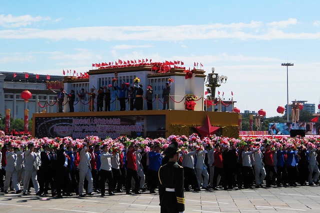 10 月1 日上午10 點,國慶60 周年慶典活動正式開始。光榮的時刻到了。11 點23 分,群眾游行隊伍開始接受檢閱,由我校師生組成的二十二總隊所組成的“民主政治”方陣全體隊列成員以高昂的士氣、飽滿的熱情接受了黨和國家領(lǐng)導(dǎo)人、全國人民的檢閱。