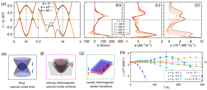 圖2:(a) 交錯磁體RuO2的能帶結構;(b-d) RuO2的晶體霍爾電導率、晶體能斯特電導率和晶體熱霍爾電導率隨溫度的變化;(e-g) 導致晶體熱輸運現象的三種物理機制:外爾贗節線、交錯贗節面、交錯階梯躍遷;(h) 不同費米能級位置處反常輸運洛倫茲比率隨溫度的變化。