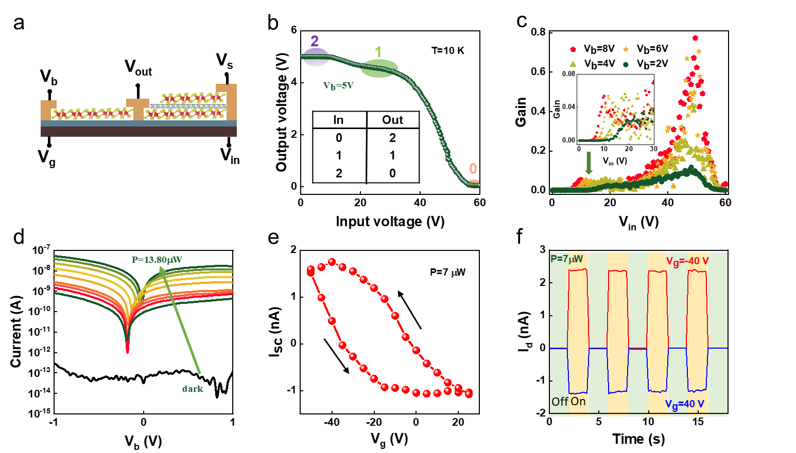 圖5展示了基于扭曲堆疊共振隧穿晶體管的三值邏輯逆變器和可調自供電光電探測器的應用。圖a展示了由158°扭曲堆疊共振隧穿晶體管和ReSe2 場效應晶體管組成的三值逆變器示意圖。圖b展示了逆變器輸入電壓與輸出電壓的關系,展示了三值的識別。圖c展示了逆變器增益與輸入電壓的關系。圖d展示了1.8°扭曲堆疊共振隧穿晶體管的功率依賴光電流與偏置電壓的關系。圖e展示了柵電壓依賴的光伏電流,展示了自供電光電探測器的可調性。圖f展示了在±40 V柵電壓下的光伏電流耐久性測量。