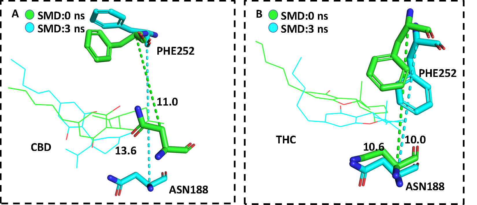 拉伸分子動力學模擬則直觀展示了部分激動大麻二酚和完全激動劑四氫大麻酚對GPR18活性口袋作用的顯著影響,以及它們與受體結合后的構象穩定性和動態行為差異。這些結構上的差異為理解大麻二酚和四氫大麻酚與GPR18結合的不同機制提供了重要依據。